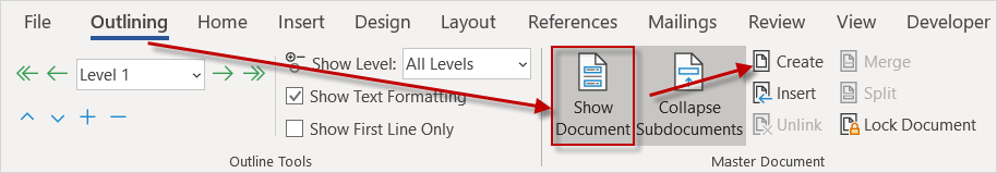 - In the Outlining tab, in the Master Document group, click Show Document. New options are displayed in the group Master Document.